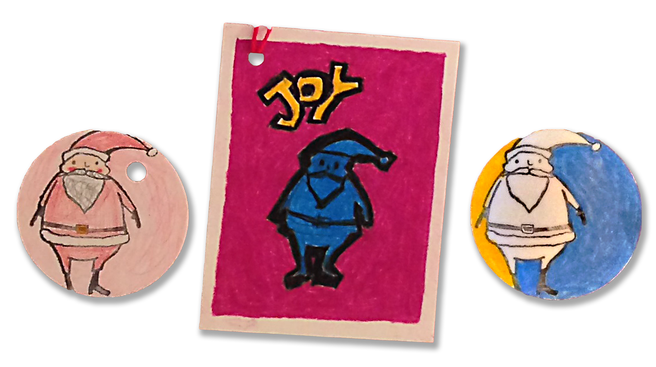 Cut cards out of the white cardstock in circles, rectangles, or any shape you like, then stamp with your design. Let the stamped tags dry overnight. The next day, gather friends and family around a table and get creative coloring. Punch holes in completed tags and add the string tie. To attach the tie, fold a precut piece of bakers twine in half and insert the folded edge through the hang tag hole. Next thread the two cut edges from the opposite end of the twine through the loop and pull gently to tighten.
